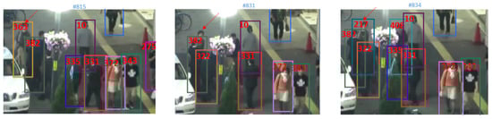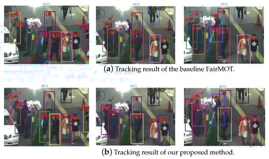 Multiple Object Tracking (MOT) [] is one of the hotspots in the field of computer vision. Object detection and re-identification (Re-ID) are key modules of a MOT pipeline. The solution of MOT can be mainly partitioned into three steps, including locating multiple objects, maintaining their identities, and yielding their trajectories given the input video. The MOT algorithm [,,,,] can be widely used in intelligent traffic flow monitoring [] and autonomous driving []. Both the accuracy and the robustness of the MOT algorithm are of great significance to the validity and reliability of these intelligent applications. However, MOT is a very complicated task that is difficult to solve. On one hand, MOT needs to detect objects with similar appearances simultaneously. On the other hand, the scenes of MOT mostly include dense crowds and occlusions. To obtain a promising result in MOT, we need to construct a robust model to generate a group of distinguishable appearance templates for the video frames. However, the appearance update mechanism of most current MOT methods is formulated as a simple linear combination of the appearance template of the previous frame and the Re-ID feature of the current frame, which will cause a serious misidentification of the current object if the appearance template of the previous frame is incredible, owing to some severe occlusions. The problem is worse when similar objects occur in scenes with dense crowds and occlusions. For example, in Figure 1, the ID of the person with a red arrow changes from 363 to 217 when the object we are tracking is occluded.