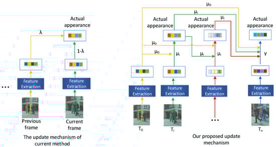 The detailed information of the appearance template update mechanism of the current method and the appearance template update mechanism of our proposed method. , , and are hyperparameters.