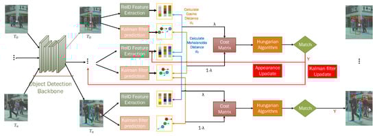If only motion models are used for matching in crowded scenes, the matching process will result in the misidentification of the object, as there will be many other people in the vicinity of the object and no appearance features are used to distinguish it. Thus, we introduce the appearance model, which will be made more accurate by combining it and the motion model for matching. We take as the appearance template obtained in the previous frame, as the Re-ID feature obtained in the current frame, and f as the updated appearance template of the current frame. is a hyperparameter. Specifically, all of the FairMOT, DeepSort, and CenterTrack algorithms set the value of to 0.9. The formula for updating the appearance model is as follows: