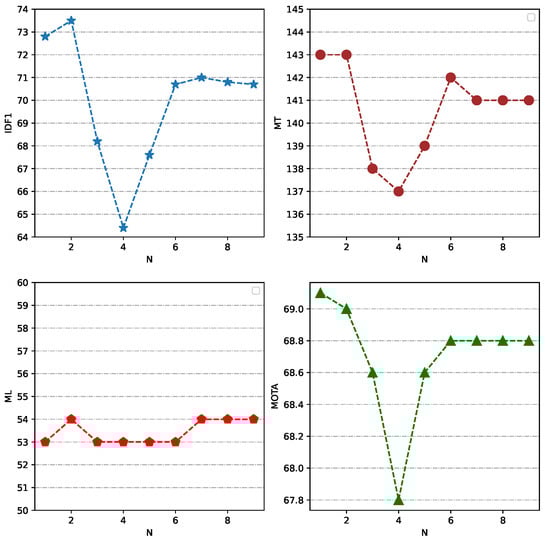 The change of IDF1, MT, ML, and MOTA indicators as N changes.