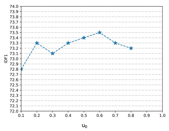 Comparison of different numbers of appearance template frame: In order to verify how many frames the finite-tailed window has in our update mechanism, we set N in Formula (7) to two, three, and up to nine for the experiment, respectively. We use a dynamic weight-distribution method. For the different frames used for the update, we fixedly set in Formula (7) to 0.1. We set the value of in Formula (7) as large as possible and set the same value to the rest of . From the experimental results, we can find that when the N is two, the IDF1, MOTA, MT, and ML indicators can obtain a good result, especially the IDF1 indicator, which obtains the maximum value of 73.5. When the N increases from two to four, the IDF1, MOTA, MT, and ML indicators begin to decline, and obtain the lowest score when the N is four. When the N is increased from four to seven, the IDF1 and MOTA indicators begin to rise. When the N exceeds seven, all indicators tend to stabilize. Therefore, we select N as two in our update mechanism. Next, we explore how to distribute the weight of the frame. We set the value of to 0.1–0.8. We find that when the value of is 0.6, the IDF1 indicator achieves the highest score. Thus, we set the value of to 0.6 in our update mechanism. Therefore, the final settings of our experiment are N = 2, = 0.6, = 0.3, and = 0.1. The specific experimental results are shown in Figure 4 and Figure 5.