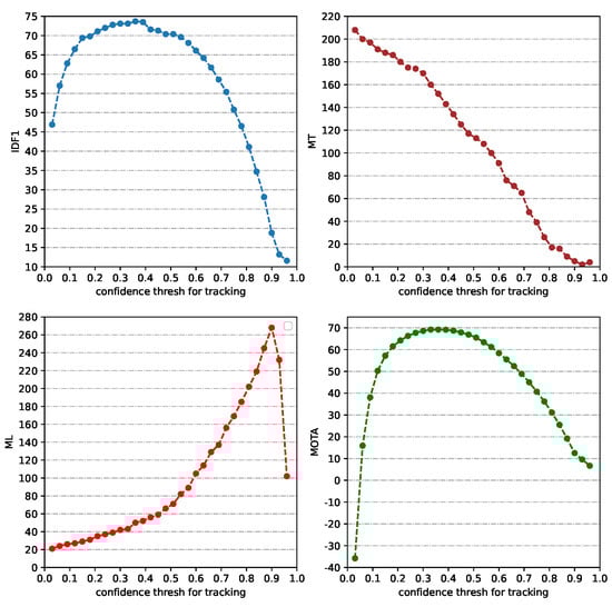 Parameter discussion: We also verified the influence of the tracking confidence threshold on the IDF1, MT, ML, and MOTA metrics obtained by our method. We adjust the tracking confidence threshold from 0.03 to 0.96, adding 0.03 to the tracking threshold for each experiment. The rules of the IDF1, MT, ML, and MOTA indicators, following the change of the tracking confidence threshold, are shown in Figure 6.