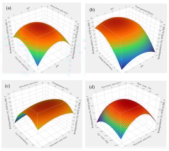 Optimization of physical parameter for biodegradation: The process of biodegradation depends on the fungal growth in the mixture which is dependent on various physical parameters including pH, temperature, time period, dye concentration and fungal inoculum size. The effect of all five parameters on the biodegradation of three effluents was checked by employing RSM. The results obtained were used to generate the 3D graphs, showing the influence of every parameter on biodegradation and also the interaction of these parameters with each other during the process. The results showed that 76.20 ± 1.4% biodegradation of MT effluent was obtained at pH 5.2, a time period of 08 days, a size of inoculum 6.40 mL, temperature 26.90 °C and dye concentration 0.04%. There was positive interaction between all the parameters during the biodegradation process as indicated by the 3D response surface graphs (Figure 1) [15]. The significant effect of these parameters on the biodegradation process was confirmed by statistical analysis and indicated by low p value (p > 0.001), high F. ratio (26.48) and high R2 value (R2 = 95.70%).