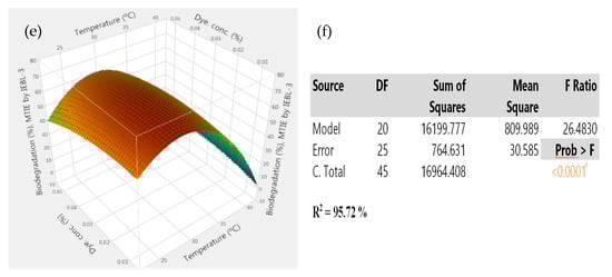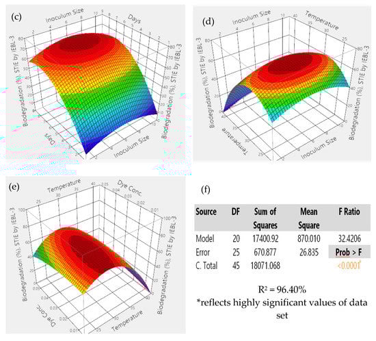 The 3D response surface graphs of interaction between parameters during the bio-degradation of ST industrial effluent by P. betulinus IEBL-3; there is positive interaction between (a)—pH and size of inoculum (b)—pH and temp. (c)—size of inoculum and time (d)—size of inoculum and temp. (e)—temp. and dye conc. (f)—statistical analysis.