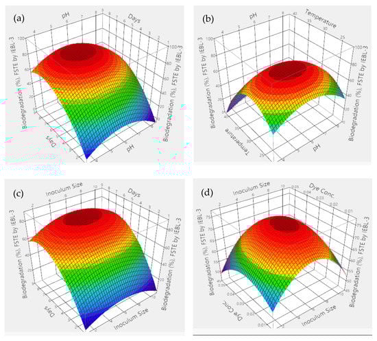 There was almost 72.09 ± 1.2% biodegradation of FS industrial effluent, and the most suitable conditions were pH 5.6, time of 08 days, size of inoculum 6.60 mL, temp. 27.09 °C and dye concentration 0.038%. The biodegradation obtained was the combinatorial effect of all of the five parameters under study, indicated by the 3D graphs obtained from the results (Figure 2). There was a significant effect on all the parameters on the biodegradation, which was also confirmed by a low p value (p > 0.001), high F. ratio (30.86) and high R2 value (R2 = 96.40%) [4].
