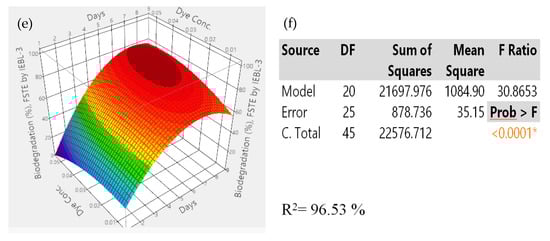 The 3D response surface graphs of the interaction between parameters during the bio-degradation of FST industrial effluent by P. betulinus IEBL-3; there is positive interaction between (a)—pH and time (b)—pH and temp. (c)—size of inoculum and time (d)—size of inoculum and dye conc. (e)—time and dye conc. (f)—statistical analysis (* indicate significance of value).