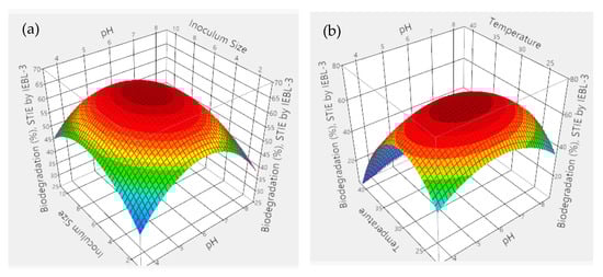 During the current study, there was 67.10 ± 1.2% bio-degradation of ST industrial effluent obtained. The most favorable conditions were pH 5.4, time of 08 days, size of inoculum 6.06 mL, temperature 26.90 °C and dye concentration 0.04%. The analysis of 3D graphs indicated that the maximum biodegradation achieved was the result of the positive and combinatorial effect of all five parameters (Figure 3). The significant effect of all parameters on the process of biodegradation of ST effluent was confirmed by the statistical analysis and indicated by a low p value (p > 0.001), high F. ratio (32.42) and high R2 value (R2 = 96.50%) [3].