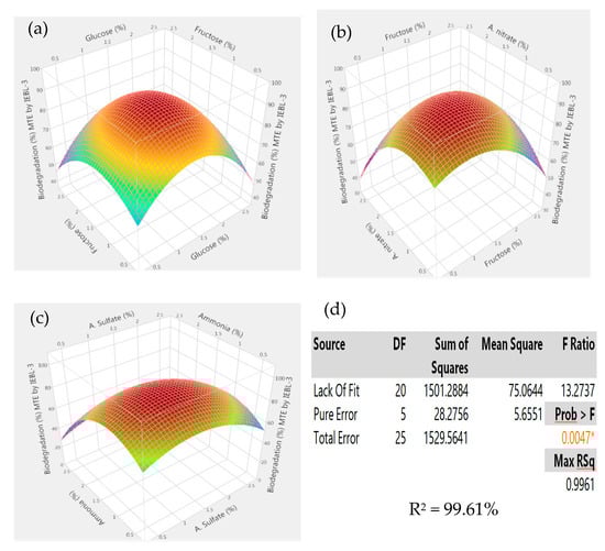 Response surface 3D graphs showing effect of carbon and nitrogen sources on the biodegradation of Mujahid Textile (MT) industrial effluent by P. betulinus IEBL-3; graphs represent positive interaction between (a) fructose and glucose, (b) ammonium nitrate and fructose and (c) ammonia and ammonium sulfate. (d) Statistical analysis indicating the significant effect of parameters (* indicate significance of value).