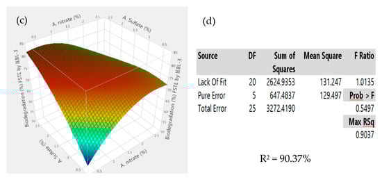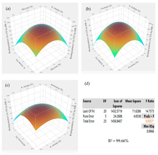Response surface 3D graphs showing effect of carbon and nitrogen sources on the biodegradation of Five Star Textile (MT) industrial effluent by P. betulinus IEBL-3; graphs represent positive interaction between (a) ammonia and fructose, (b) ammonia and a. nitrate and (c) a. sulfate and a. nitrate. (d) Statistical analysis indicating the significant effect of parameters.