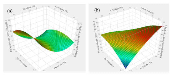 There was almost a 10.00% increase (76.23 ± 1.43% to 86.17 ± 1.02%) in the biodegradation MT industrial effluent after the addition of carbon and nitrogen sources in the biodegradation mixture (Figure 4). The 3D response surface graphs indicated the positive response between different nutrients which lead to enhanced biodegradation of the effluents. The increase in the biodegradation was almost 7.00% (72.09 ± 1.22% to 79.14 ± 1.12%) in the FST industrial effluent (Figure 5). There was a 9.00% increase (67.16 ± 1.24% to 76.22 ± 1.16%) observed in the biodegradation of the ST industrial effluent after the addition of carbon and nitrogen sources in different ratios (Figure 6). Further analysis of the 3D response surface graphs showed that biodegradation increased when there was a low and equal amount (1:1) of all carbon and nitrogen sources present in the biodegradation mixture [15,22]. Presence of carbon sources up to 2.20% and nitrogen sources up to 1.20% (except ammonia) showed a positive effect on the biodegradation process. There was a decrease in the biodegradation% when ammonia was more than 1.25% in the biodegradation mixture. A higher concentration of ammonia than certain limits causes stress, which leads to lower microbial growth [23]. This may be due to the inhibitory effect of ammonia on proteins involved in microbial growth by degrading nutrients. Similarly, there is a lower biodegradation% in the current study at a higher ammonia concentration, possibly due to the inhibitory effect on enzymes involved in the process [4]. Further, additional nutrients in the media increased the biodegradation process only when present in the right amount and ratio; otherwise, it leads to the instability of the enzymes and lowers the biodegradation. There are other studies that have reported the positive roles of various carbon and nitrogen sources in the biodegradation of different dyes [13,24].