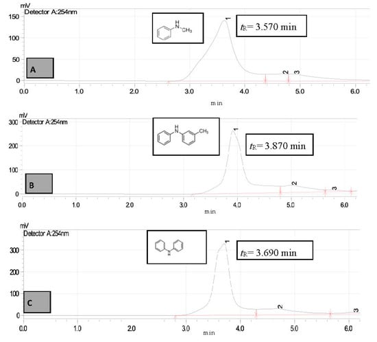 HPLC chromatogram of standard secondary amines (A)—N-methylaniline (tR = 3.570 min) (B)—3-Methyldiphenylamine (tR = 3.870 min) and (C)—Diphenylamine (tR = 3.690 min).