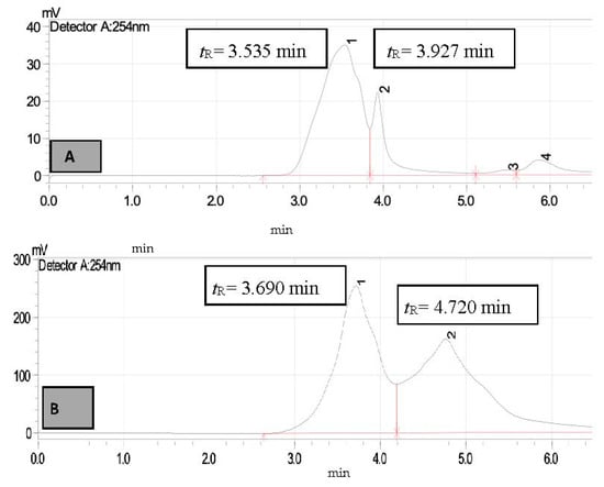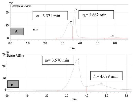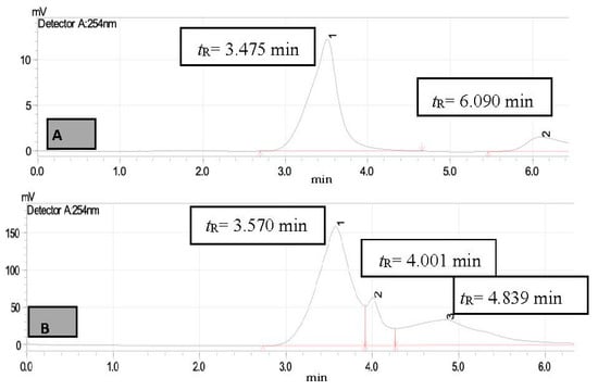 HPLC chromatogram of STIE (A)—untreated sample (B)—treated sample, peak 1 for diphenylamine (tR = 3.690 min) and peak 2 (tR = 4.720 min) for unknown compound.