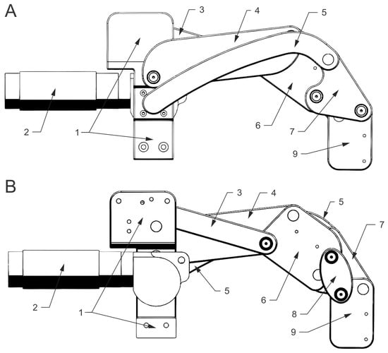 Figure 1 shows a lateral (A) and medial (B) view of the mechanism, depicting the successive connection of the segments. The numbers in Figure 1 correspond to the following parts—the mounting bracket (1), actuator (2), upper (3), middle (4), lower (5), central (6), triangular (7), oval (8), and the end (9) segment.