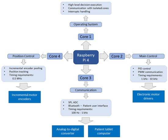 The program consists of several functionally split real-time and non-real-time processes. The real-time processes must be executed at specific time intervals, while the non-real-time processes do not require such strict timing. Therefore, the processes with similar time requirements run together on the same core. The first core is used for non-real-time processes such as high-level decision execution and OS functionalities. All other three cores are hidden from the OS interrupts and only work on their respective tasks: position and force control of the motors, communication, sensor data acquisition, and motor position tracking. Since the real-time processes managing cores are isolated from the Raspbian OS, their timing efficiency is increased.