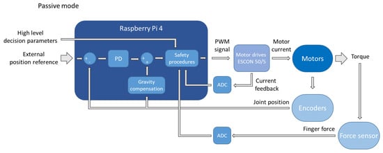 The high-level control is used to set the movement boundaries, the level of assistance or resistance, and to choose between the four training modalities—passive, assisted, active, and resistive. In the passive mode, where the device is active and the patient is passive, position control is implemented using the encoder feedback and the proportional-derivative (PD) control approach. Figure 4 depicts a block diagram of such a PD control. The first inputs of the controller are the high-level decision parameters defined by the therapist—such as maximum ROM and maximum permissible force. These parameters are considered in the safety procedures that limit or decrease the controller’s output to prevent violation of any safety requirements. Since the device should be positioned flat on the table during operation and the motion is executed only in the sagittal plane, the effect of gravity on the device is known and can therefore be compensated based on the joints’ positions. This compensation is performed in order to minimise the steady-state error. The motion reference is determined according to the prechosen parameters, while the proportional and derivative constants were tuned for critically damped behaviour.