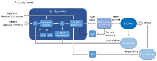 In the assistive mode, the device facilitates motion in parts of the movement, which the patients cannot yet perform themselves—only assisting the motion when needed. The device acts as a mass-damper-spring system in this mode, allowing the patient to deflect the device from the reference position by implementing an impedance control approach. Figure 5 depicts the block diagram of the assistive mode. It differs from the passive mode mainly in substituting the PD regulator for an impedance control block. This block calculates the desired force based on the current position, velocity, acceleration, and other high-level parameters—i.e., the level of assistance and the parts of movement where they are applicable.