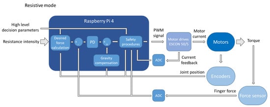 Direct force control is implemented in the resistive mode, where the device generates controlled resistance, opposing the patient’s motion. Figure 6 depicts the block diagram of the resistive mode. It is again similar to the passive mode, with the difference being that the force, instead of position, is regulated. Force feedback is provided by the strain gauges installed on the distal finger rest, while the reference force is determined by the position of the wrist joint, gradually decreasing in extension.