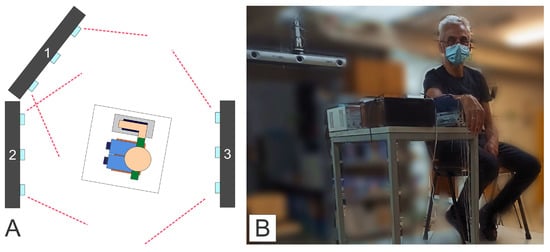 The measurement set up with three cameras—1, 2, 3 (A), and a subject within the measurement set-up (B).