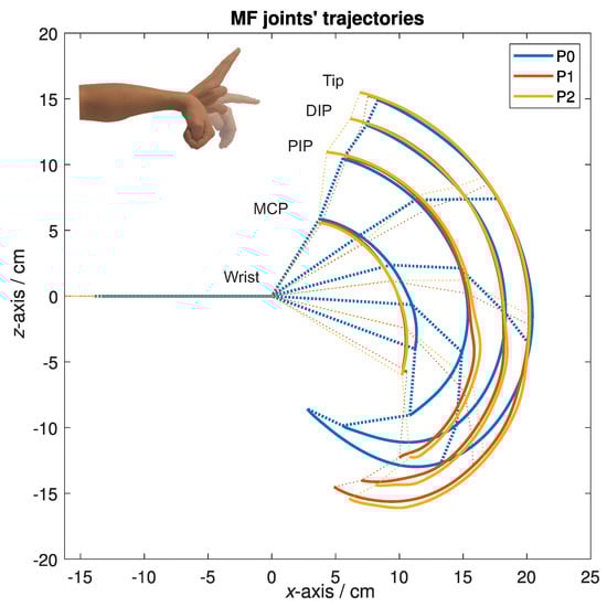 Figure 8 depicts representative trajectories of the markers on the MF joints for all three experimental conditions for one of the subjects. The trajectories are depicted in the sagittal plane—along the x and z-axis, showing how each marker was moving as the subject performed the protocols. The solid lines represent the trajectories obtained from each protocol—the blue colour represents the P0 protocol, the red colour represents the P1 protocol, and the yellow colour represents the P2 protocol. The dashed lines of the same colours are used to help visualise the corresponding positions of skeletal structures of the hand at the specific points along the trajectories—the markers were used as a representation of the wrist and finger joints positions. The point (0, 0) in Figure 8 represents the wrist, and the lines along the negative x-axis represent the forearm. From left to right, the trajectories in Figure 8 correspond to the movement of the markers on the MCP, PIP and DIP joint, and the tip of the MF.