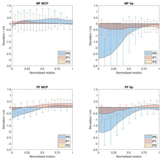 To numerically evaluate the similarity of the trajectories of the selected MF and PF joints across different protocols, we calculated the deviation of trajectories from a base-line joint’s trajectory, obtained during P2 protocol. The yellow lines in Figure 8 depict the base-line trajectories of the MF for one of the subjects during the P2 protocol; however, Figure 9 shows graphs with the normalised results, averaged across all subjects, for the MF’s and PF’s MCP joint and the fingertip.