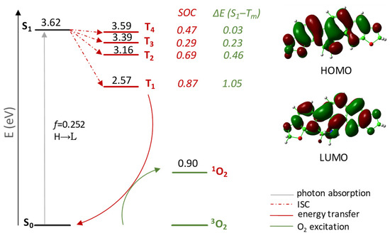 Jablonski-like diagram of DHSAN for 1O2 formation and its frontier orbital contour plots. SOC values, in cm−1, and ΔE(S1–Tm), in eV, are also reported. All the calculations were carried out in implicit water solvent.