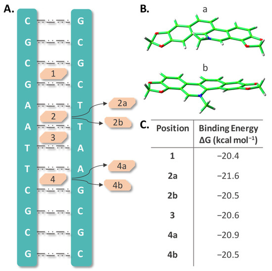 As underscored above, the various pharmacological effects exhibited by SAN including its anticancer activity, can involve SAN strong capability to bind DNA, as one of the most important mechanisms. A large number of studies have been dedicated to this aspect [53], and we are going to illustrate the outcomes of MD simulations we have carried out with the aim of obtaining more detailed information about the intercalation process. Intercalative binding is one of three different modes, together with electrostatic and groove binding, by which molecules can be non-covalently attached to DNA. The stacking effect as well as hydrogen bonding with surrounding nucleotides are, generally, prominent in determining the intercalation strength that, in turn, can induce DNA conformational and functional changes ultimately leading to cell apoptosis. For cationic intercalators, it is reported that the stabilization energy is considerably larger than for uncharged species [59]. Due to its planar structure and aromaticity, intercalation of SAN, in its iminium cationic form, is very likely. Therefore, MD simulations were performed manually putting the molecule into the adopted B-DNA dodecamer model considering different positions across the major groove of the helix between two base pairs in analogy with our previous studies [60,61,62]. The examined DNA sites are shown in Figure 3A. Due to the asymmetric structure of SAN, two different orientations of the molecule in positions labeled 2 and 4 were examined (Figure 3B). The labels used for the studied sites of intercalation are: 1 where the drug is stacked within the cytosine–guanine (CG) and guanine–cytosine (GC) base pairs, 2 corresponds to the drug stacked within adenine–thymine (AT) and adenine–thymine (AT) base pairs, 3 for adenine–thymine (AT) and thymine–adenine (TA), and 4 for thymine–adenine (TA) and cytosine–guanine (CG) base pairs stacking. The two different orientations of SAN were included adding the labels a and b to both 2 and 4 positions.