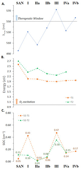 Nevertheless, as described for DHSAN, an efficient photosensitizer has to fulfill other requirements, which include a consistent spin–orbit coupling for promoting the ISC from the excited singlet to triplet electronic states, and the existence of a triplet state of proper energy to be able to excite molecular oxygen. For this reason, triplet excited states of SAN in water within the vertical approximation have also been calculated and are included in Table S3 of the Supplementary Materials. Two lowest lying triplets together with MO contributions were characterized using TDDFT. S1 and T1 transitions involve H and L orbitals with ππ* character. The HOMO delocalized on entire molecular skeletons, while the LUMO is mainly localized on the isoquinoline part (Figure S8). These triplets are shown in Figure 5B together with the computed values of the spin–orbit matrix elements ⟨Tm|HSOC|S1⟩ (panel C), from which the efficiency of the ISC depends on together with the singlet–triplet energy gaps, ΔE(S1 − Tm) for m = 1, 2.