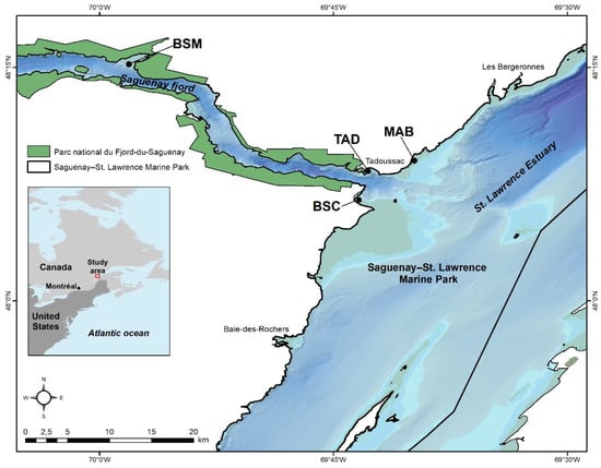The Saguenay–St. Lawrence Marine Park (Quebec, Canada), located at the confluence of the Saguenay Fjord and the SLE, is located downstream of many important urban and industrialized sites. The Marine Park is also crossed by the St. Lawrence Seaway and is the home of many commercial and tourism boating activities, namely, an important whale-watching industry [1]. Moreover, it supports recreational boat traffic, local harbors, and numerous industrial and municipal wastewater discharges. The continuous occurrence of environmental pollutants such as polyaromatic hydrocarbons, organotins, heavy metals and episodes of red tides (algal blooms) from increased nutrients in the SLE has been reported over the last decades [2,3,4]. Mya arenaria clams are commonly found in Saguenay Fjord and SLE mudflats and are well known to accumulate numerous contaminants, such as organotin [5], and many other compounds, such as arsenic and polyaromatic hydrocarbons [6]. In addition, clams are relatively long lived (12–15 y), sessile and serve as a food source to many organisms, such as rag worm Neiris diversticolor [7], gammarids, fish, birds and even beluga whales in this area. This makes them ideal bio-sentinels to monitor the water and sediment quality of coastal ecosystems and marine-protected area health.