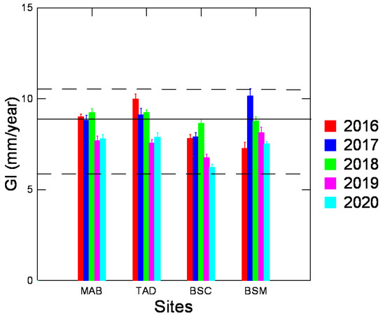Temporal changes in the growth index of clams. The GI (shell length/age) was determined in clams at each site for over the 5-year period. Legends as in Figure 2.