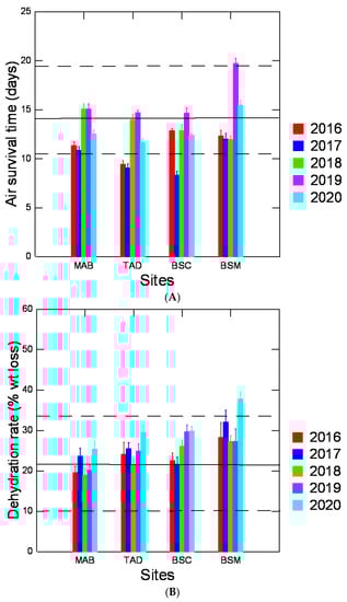 Temporal change in the air survival time and dehydration rate in clams. Clams were collected at low tide in the morning and processed immediately for air survival (A) and weight loss (dehydration rate) (B). Legends as in Figure 2.