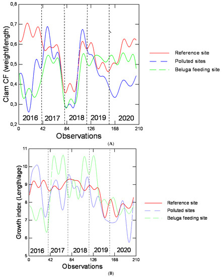 This study also permitted us to examine the temporal changes of clam health by pollution based on the proposed morphological biomarkers (CF, GI and LT) [10]. Based on these endpoints, long-term memory analysis revealed time effects deviating from random changes in time (white noise) at both polluted and BSM sites. A decrease in the CF and GI with an increasing trend in the LT over time was globally observed, i.e., all sites confounded. However, the decrease in the CF was stronger at the polluted sites and showing more intense amplitude changes (instability). At BSM, the CF tended to increase in contrast to the reference and polluted sites. With respect to GI, the decrease in time was much more severe at the polluted sites and growth instability in (high amplitude changes), while no long-term changes were observed at BSM. The LT tended to increase more steeply in time at the polluted and BSM compared to the reference site. It is possible that decreased metabolism from the elements discussed above could have contributed to the increased LT. However, the increased air survival time occurred at the expense of growth and size/condition (mass/length ratio). Reduced growth and condition of freshwater mussels was found in those caged downstream of a municipal effluent [29]. This was further supported by the fact that mussel recruitment was sparse downstream of the effluent discharge. In another study, shell length of the wild mussel Elliptio dilatata was smaller with increasing tissue concentrations of Cd, Pb and Zn from a river supporting zinc mining activities [30]. The BSM site contained clams that were mostly contaminated by Ce, Co, Ga, La, Hg, Ni, Sm and V. This raises the issue of beluga whales being contaminated by these elements. In beluga tissues collected in the Arctic near Alaska, some elements were present in beluga skin samples [31]. For example, these metals/elements were higher at some sites compared to Cook Inlet site: Ag (6.6-fold), Cd (4.4-fold), V (4.6-fold) and Hg (9.6-fold). This supports the hypothesis that SLE beluga could be contaminated as well, perhaps in part through feeding on local clam populations. It appears that Hg levels in beluga in the western Artic was not solely related to diet or Hg emissions but followed decanal oscillations [32]. Indeed, Hg contamination seems to follow large oscillations in surface water temperatures spanning many decades, the so-called Pacific or Atlantic Decadal Oscillations. The clams and perhaps beluga contamination profile could show a cyclic period from the Atlantic decadal oscillations. These oscillations occur at time scales covering many decades (10–80 years), much larger than the present time scale of the present survey. Although outside the scope of this survey, this could explain why the GI and LT did not change much over the years.