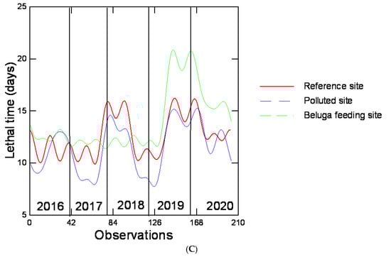 Trend analysis of biomarker data. The 5 years of biomarker data were filtered by Fourier analysis (12 principal frequencies) to observe the global trends in time for CF (A), growth index (B) and lethal time (C). Each year (40 observations) of collection is separated by dotted lines. The reference site (MAB), polluted sites (BSC and TAD) and SLE beluga area (BSM) are marked in different colors.