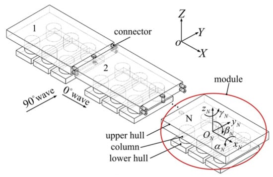 A very large floating structure (VLFS) is a unique concept for an oceanic structure that embraces a range of unprecedented parameters, being thousands of meters long, weighing several tons, and costing between USD 5000~15,000 million, etc., [1]. VLFS could be used as floating fuel storage facilities, floating airports, floating cities, and so on. These prospective applications have aroused enormous enthusiasm in researchers to explore the VLFS-related theories and technologies that have been around since the 1980s [2]. One of the most famous VLFS is the mega-float model, which was built and tested in Tokyo Bay [3,4]. The mega-float model is a flat structure that is usually modeled as a beam or plate, the dynamic characteristics of which were investigated through the use of hydroelastic theory [5,6]. Mega-float models have the merits of easy manufacturing, deployment, and maintenance, but huge bending stress occurs in the structure, making it vulnerable when deployed to rough seas. To overcome this problem, a multi-modular type of VLFS has been considered [7], which consists of a number of floating modules connected by connectors. These VLFS modules could be broadly classified into two types: pontoon types and semi-submersible types [2,8]. The pontoon type is the only type that is suitable for deployment in calm waters [9], and the semi-submersible type can withstand large waves in open seas [10]. For multi-modular VLFS, connectors are the key components to hold the integrity of the VLFS and greatly influence the responses and the stability of multi-modular VLFS.