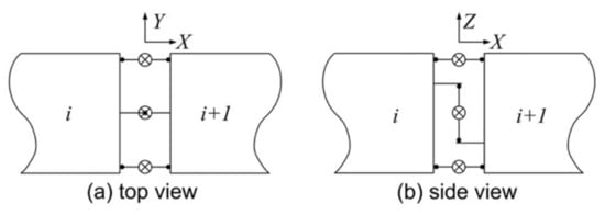 where symbol is the mass of the ith module. The symbols , and are the rotary inertias for the , and axes, respectively. Symbol is the density of water, and is the acceleration of gravity. Symbol is the water plane area, and is the volume of the water. Symbol is the design draft, and is the height of the center of gravity. On the right-hand side of Equation (1), symbol expresses the wave excitation vector determined by the linear wave theory [36]. Symbol indicates the connector force vector acting on the ith module. Vectors and are derived as discussed in the paragraphs below.