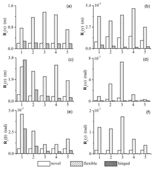 We first looked at the results of the intended surge, heave, pitch, and yaw motions to be controlled. Figure 6a,f show the surge and yaw motions of the five modules. Apparently, the motions with control of the novel connectors are much smaller than those of the flexible connector without control. The surge motion of the novel connector is almost the same as that of the hinged connectors, and the yaw motion of novel the connector is larger than that of the hinged connectors. Because hinged connectors are almost completely rigid in the x, y, , and directions, the surge, sway, roll, and yaw motions of the VLFS with hinged connectors are usually small. Figure 6c,e show the heave and pitch motions, respectively. We can see that these two motions are significantly reduced by the control strategy in comparison to the flexible and hinged connectors. It seems a bit peculiar that the heave and pitch motion of the first hinged module is larger. One reason for this is that in heading waves, the first few modules usually have larger responses than others especially, for the pitch motions that are unconstrained by hinged connectors. It is interesting to see that the controlled motions of all of the modules in a specific direction are at almost the same level, which implies that the control scheme realizes the equal weights assigned to the motions of different modules. For the unintended suppression directions of the sway and roll motions shown in Figure 6b,d, the novel connectors with control significantly outperform the flexible connectors because of the couple between the different degrees of freedom.
