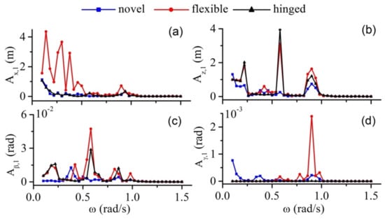 The performance of the vibration control method with the stiffness-adjustable connectors can be evaluated based on individual wave frequency. The results in Figure 6 come from the compound results calculated by Equation (26) and by the wave spectrum. Figure 7 only shows the intended motions of surge, heave, pitch, and yaw for the first module over the span of the wave frequency, based on Equation (26). For the surge motion, as shown in Figure 7a, the response of the novel connector is close to that of the hinged connector and is far smaller than that of the flexible connector. For the heave and pitch motions shown in Figure 7b,c, the novel connector (the blue curve) outperforms the other two connectors since the actuator of the novel connector can eliminate or reduce resonance near wave frequency of 0.628 rad/s and 0.9 rad/s by changing the connector stiffness. In the yaw response shown in Figure 7d, the rigid connector has lowest response because of its rigidity. The novel connector greatly reduces the peak of the flexible connector (red line) at 0.9 rad/s, but the novel connector (blue line) has a peak in the very low frequency below 0.25 rad/s. We can state that at low frequency, this peak at low is in fact very small and ignorable, in view of the quantity order of the yaw response. Note that the wave energy is mainly distributed at around 0.628 rad/s. The contribution of the responses from lower frequencies would be insignificant to the 1–in–1000 amplitude.