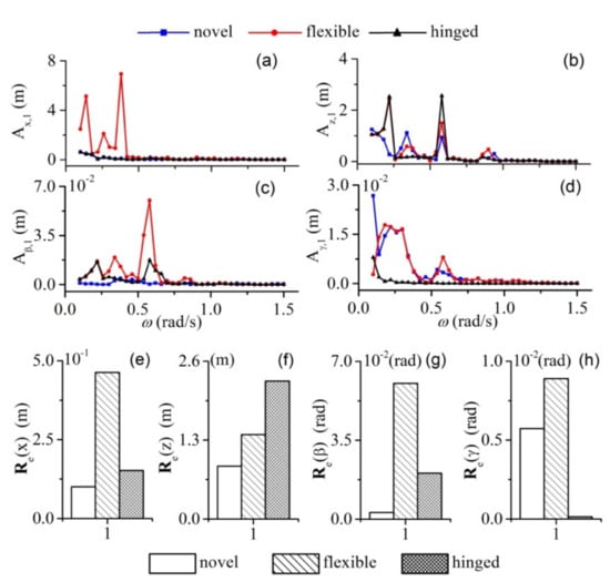 Next, we present the scenario where the incident angle was . Figure 8a–d show the responses of the surge, heave, pitch, and yaw motions of the third module versus the wave frequency. In surge motion, the novel connector and rigid connector perform almost equally well and much better than the flexible connector. In the heave and pitch motions, the novel connector outperforms the other two connectors because the actuator of the novel connector takes effect. For the yaw motion, the novel connector performs better than the flexible connector around the main wave frequency of 0.628 rad/s but performs worse at very low frequencies. Since the peak of the yaw response is about 0.027 rad at low frequency, its contribution to the 1–in–1000 extreme responses is insignificant. Figure 8e–h show the 1–in–1000 extreme responses for the third module, which were induced by the wave spectrum in Equation (32). For the surge, heave, and pitch responses, the novel connector performs the best among the three types of connectors. As for the yaw motion, the novel connector greatly outperforms the flexible one. For a slender floating system, the hydrodynamic load on the floating structure is closely related to the wave incident angle. It is necessary to study the effect of the wave incident angle on the performance of the novel connector.