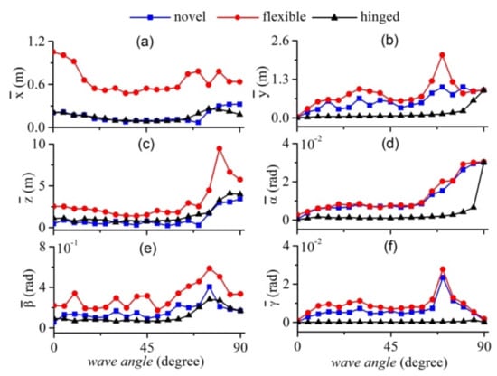 Next, the performance of the vibration control method was studied at different wave incident angles. To present the results neatly, we used the mean response of all of the modules at each degree of freedom to represent the essential nature of the system motion in that direction. For example, the symbol denotes the mean 1–in–1000 extreme surge responses of the whole floating structure in x direction. The mean responses of the five-module floating structure are presented in Figure 9, where the horizontal axis is the wave incident angle from to .
