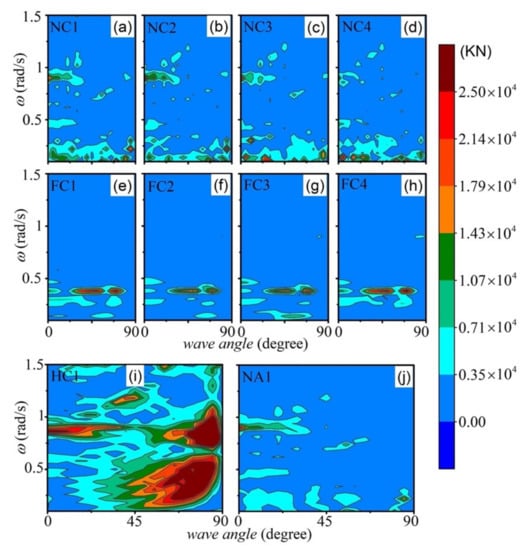 The cloud charts of (a–d) the novel connector load of the first connector of all four groups (FC1–FC4), (e–h) the flexible connector load of the first connector of all four groups (NC1–NC4), (i) the hinged connector load (HC1) between the first and second module, and (j) the actuator output force of the first novel connector in the first group (NA1) in a domain spanned by the wave frequency and wave incident angle.