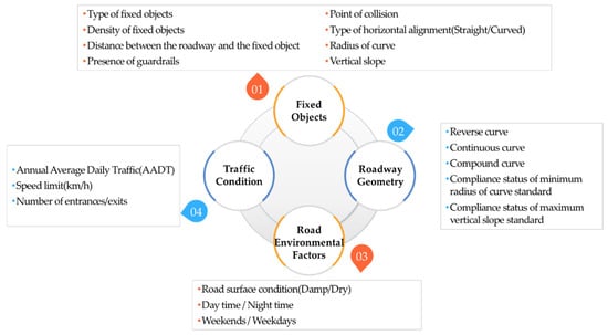 As shown in Figure 1, the collected variables for each factor were as follows: eight variables of the object for roadside fixed objects, six variables of the RORC section for roadway geometry, three variables of traffic conditions, and three variables of road environmental factors. Fixed objects is a characteristic of the characteristics and location of fixed obstacles, and additionally, since it collides with fixed obstacles due to the accident characteristics of RORC, the collision location is included. Roadway geometry includes the flat linearity of the road, the vertical alignment, the harmony of the alignment, and whether the design criteria were satisfied. Road environmental factors include the weather environment and the date and time of the accident. Traffic condition includes factors for traffic flow operation conditions.