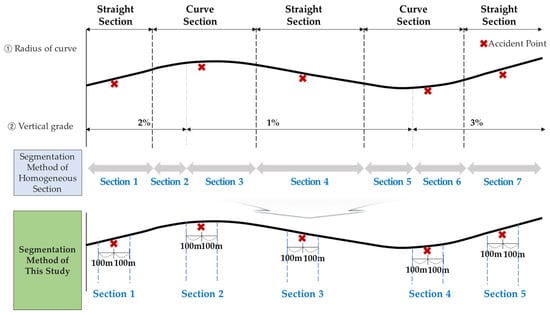 In the segmentation method of the homogeneous section, the length of the section is increased by including both longitudinal and planar curve coincidence sections, and changes in other factors within the section occur significantly. This is because the characteristic is averaged over all “fixed objects” in the interval. However, the segmentation method of this study can minimize the factor change for “fixed objects” while reflecting the characteristics of the homogeneous section. In addition, within the same section, further classification was made according to factors such as the horizontal alignment (whether straight/curved), the radius of the curve and the vertical slope, and the combination status of reverse curve/continuous curve/compound curve, plane curve, and the vertical slope.