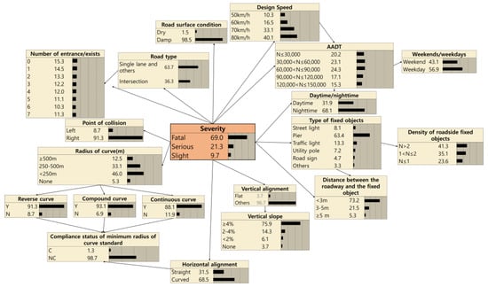 The probability of being classified into one of the three RORC severity categories in the situation of individual data was calculated. Among the calculated values, the category with the largest probability value was selected as the predicted value. The main function of the existing regression model is to select factors that influence RORC severity, whereas machine-learning techniques, such as the Bayesian network, focus on predicting the category that the data will fall into among the three categories of RORC severity. For example, as shown in Figure 5, in case of a crash with a pier that is 2.5 m away from the roadside while driving on a road composed of a vertical slope of 4.5%, design speed of 80 km/h, damped road surface, weekdays, AADT is 33,000 vehicle/day, single lane, two entrance, weekdays, nighttime, a radius of the curve of 300 m, and with the presence of a compound curve, the probability of a fatal accident is 69.0%