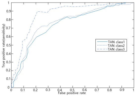 Figure 6 shows the results of plotting the ROC curve with the Tree Augmented Naïve Bayes (TAN) model. Because of the area under the ROC curve calculation, the AUC value was 0.763 for slight accidents, 0.797 for serious accidents, and 0.917 for fatal accidents. This shows that the classification prediction power for fatal accidents is the best. Generally, when AUC is less than or equal to 0.5, the result is not considered suitable, and the AUC from 0.9 to 1.0 can be interpreted as very accurate, while that from 0.7 to 0.9 is interpreted as relatively accurate.