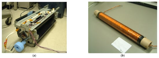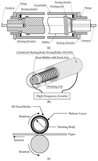 An IH-based fixed roller for printing and copy machines is specially developed in a laboratory. This fixed roller uses IH and directly heats the external roller to the printing toner. This directly heated IH-based fixed roller is highly efficient in comparison to indirect radiant heat generated by the use of a halogen lamp, which is conventionally used. Further, an IH fixed roller’s surface temperature (160–200 °C) can be easily controlled. Fixed roller structure is shown in Figure 1a,b. The IH fixed roller is composed of a rolling drum with a heating coil wound around an internal resin bobbin. Figure 1c illustrates an IH fixed roller toner fixing process. Surfaces of an aluminum or iron heating body have a release layer. This layer is composed of either a soft type with an elastic body or a hard type with a resin. Full-color printing and copy uses the soft type, and mono-color uses the hard type. Magnetic stainless steel (SUS 410) is used in the heating body. Carbon ceramic or an alloy of titanium can also be used.