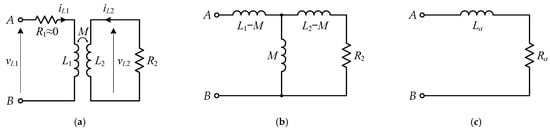 Transformer circuit model for IH fixed roller. (a) Transformer model. (b) Transformer equivalent circuit model. (c) L-R series equivalent circuit model.
