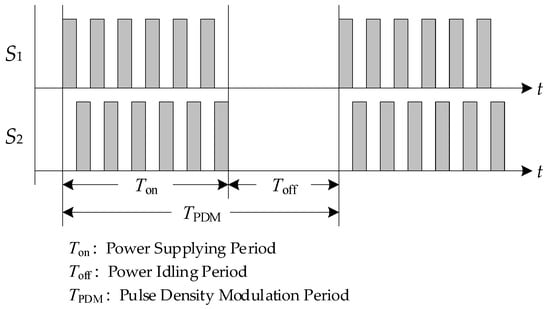 Generally, pulse modulation methodology is employed in the high-frequency inverter to achieve output power regulation for IH application. Mainly, there are three types of modulations, which are as follows: (i) pulse frequency modulation (PFM) [,], (ii) pulse width modulation (PWM) [] and (iii) pulse density modulation (PDM) [,,,]. The simplest modulation technique is PFM. Hence, it is the most widely employed with a single-switched inverter, and a variable switching frequency is used for controlling the injected currents from the voltage power source. However, the variation of the switching frequency for control of the IH load parameters is a disadvantage for domestic applications. As a result, the inverters with PFM-controlled schemes emit some annoying acoustic sounds []. By contrast, the sound of inverters with PWM-controlled schemes is quieter. However, the power conversion efficiency of PWM inverters is lower when they are operated at low power output due to soft-switching commutations, which are likely to fail [].