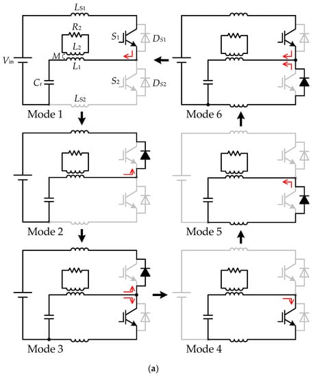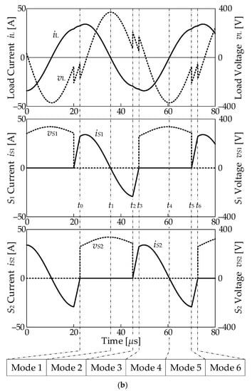 The proposed soft-switching inverter circuit mode transitions for the IH fixed roller are shown in Figure 5a. Figure 5b shows the current and voltage waveforms in each mode of operations. Each mode of operating principle is explained as: