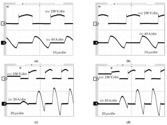 Figure 8a,b illustrate the operating waveforms of the current and voltage of the power semiconductor switches S1 and S2. These figures show that ZCS soft-switching commutation is achieved in the transitions from turn-on and turn-off. The waveforms of the current and voltage of switches S1 and S2 are shown in Figure 8c,d for the beginning interval of the injection of power. Observing waveforms in Figure 8c,d, the switches S1 and S2 also operate for PDM control implementation using complete ZCS soft-switching commutation.