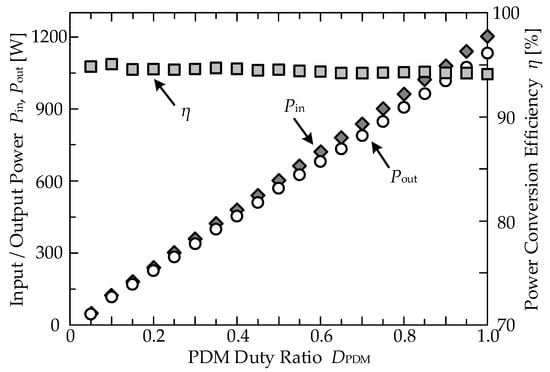 The power conversion efficiencies and input/output for the soft-switching high-frequency inverter are given in Figure 9. Changing the PDM duty ratio DPDM causes linear regulation of the output. The PDM operates at DPDM = 1.0 in the printing mode and at DPDM = 0.05 in the stand-by mode. More than 94% power conversion efficiency η can be achieved with a DPDM = 0.05 to 1.0. Thus, the proposed IH fixed roller application in printing and copy machines can achieve high efficiency using the proposed high-frequency inverter system.