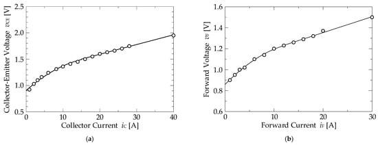 The high-frequency soft-switching power losses of the proposed inverter are extremely low. IGBT fall current and tail current losses are almost zero due to ZCS commutation. Additionally, L1 and snubber inductors LS1 and LS2 conduction losses are negligible due to litz wire usage. The IGBT conduction losses of the proposed high-frequency inverter are the main power losses. The IGBT voltage and current characteristics curves are used for conduction power losses calculations. Figure 10 shows the current and voltage characteristics of the IGBT and that its antiparallel diode has constant temperature conditions. Experimental results yielded the switching characteristics curves. Equations (13) and (14) represent the characteristic curves, which approximate quadratic polynomials in the low forward current area and linear functions in the high forward current area.